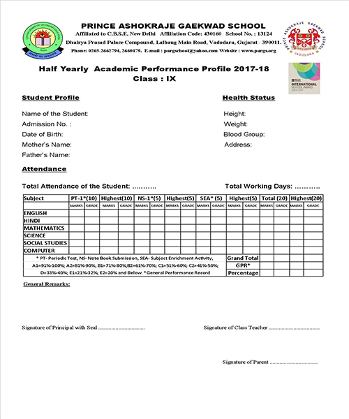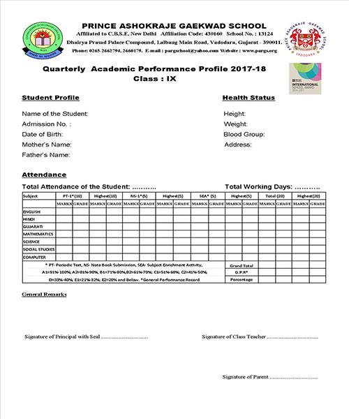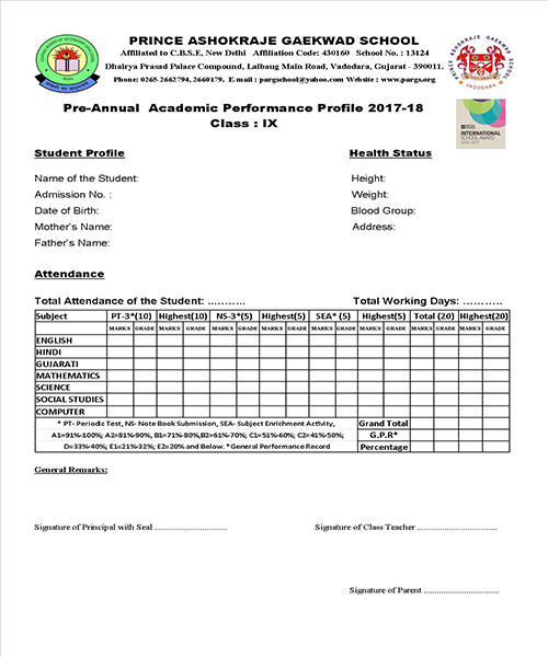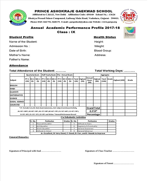 The students will be given Performance Profile reflecting their overall performance in every respect, possibly for four times quarterly, half yearly, pre annual, and annual. The format of the Annual Performance Profile is as under. |